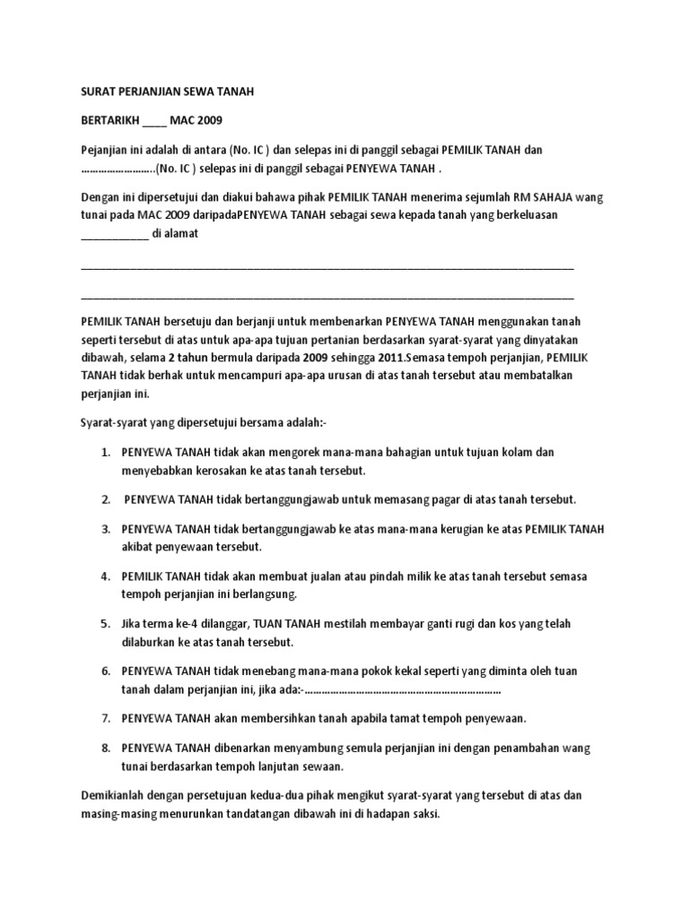 Contoh Surat Perjanjian Sewa Tanah Di Malaysia / Dalam surat perjanjian sewa ruko atau kios ini sangatlah menguntungkan dari kedua pihak yang bersangkutan di dalamnya, karena dalam penyewaan baik pihak pertama maupun pihak kedua sangat di lindungi haknya dan.