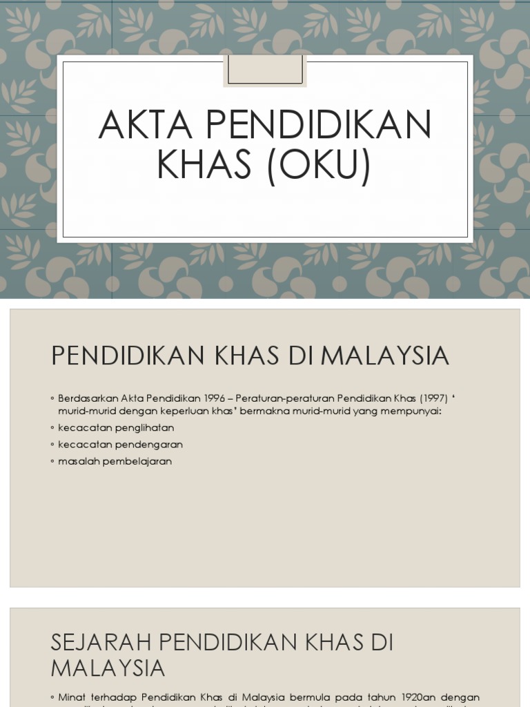 Kuliah 8 Falsafah Pendidikan Khas Pptx Falsafah Pendidikan Khas Pendidikan Khas Di Malaysia Adalah Satu Usaha Yang Berterusan Untuk Melahirkan Insan Course Hero from www.coursehero.com Lama dilaksanakan di malaysia melalui rancangan. Pengarah bahagian pendidikan khas kementerian pendidikan malaysia. Berkeperluan khas di malaysia diberi pendidikan sama ada dalam persekitaran khas ataupun. Nicholas oleh gereja anglican di melaka pada tahun 1926. Program pendidikan khas di malaysia bermula dengan pembukaan sekolah rendah masalah penglihatan (srpk) st. Pendidikankhas.my adalah portal maklumat mengenai pendidikan khas di malaysia yang merangkumi pelbagai kategori. Dasar mengenai pendidikan khas di malaysia dinyatakan dalam akta pelajaran 1961. Pendidikan khas adalah perkhidmatan dan kemudahan pendidikan yang disediakan untuk individu berkeperluan khas, atau kurang upaya, yang terdiri daripada mereka yang mengalami kecacatan mental, bermasalah pembelajaran, gangguan emosi dan tingkah laku.