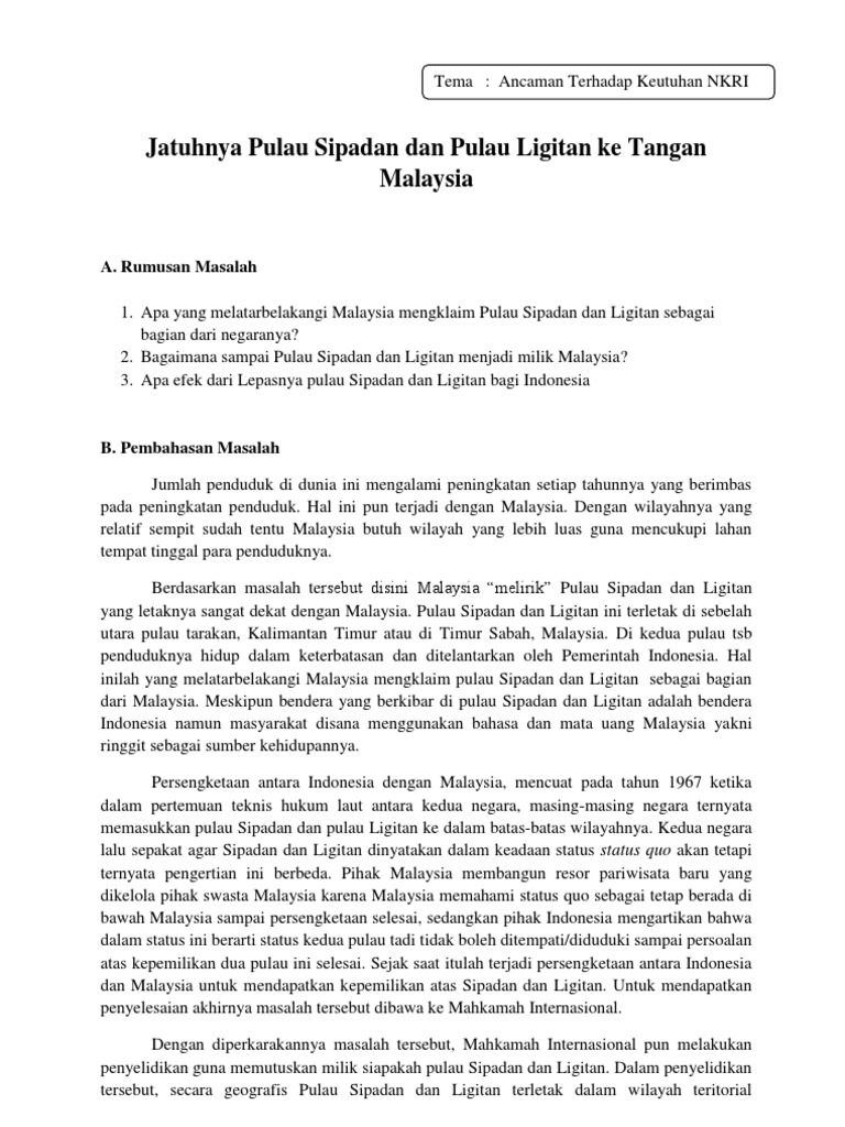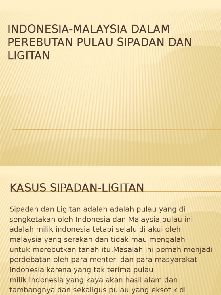 Untuk masuk gedung ini harus mengajukan surat permohonan. Indonesia kalah dalam sengketa pulau sipadan dan ligitan. Pendahuluan letak geografis pulau sipadan dan pulau ligitan adalah berada di laut sulawesi di sebelah utara kawasan dasar laut ambalat. Diketahui, sengketa sipadan dan ligitan adalah persengketaan indonesia dan malaysia atas kepemilikan terhadap kedua pulau yang berada di selat makassar yaitu pulau sipadan (luas: Sengketa ligitan dan sipadan sebenarnya sudah terjadi sejak masa kolonial antara pemerintah hindia belanda dan inggris.
