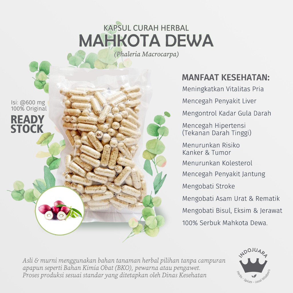 Sifat dan khasiat mahkota dewa. Cara konsumsinya cukup mudah, yaitu hanya dengan merebus buah dari mahkota dewa yang sudah kering dan konsumsi 2 kali sehari untuk hasil yang maksimal. Daun dan biji digunakan untuk pengobatan: Pohon mahkota dewa (phaleria macrocarpa) atau dalam bahasa melayu pohon simalakama, yang buahnya juga di sebut buah simalakama. Khasiatnya dalam mengobati berbagai macam penyakit, khususnya diabetes melitus, membuat tanaman ini dikenal banyak orang. Dapat digunakan sebagai obat kuat sehingga sangat baik untuk menambah vitalitas pria. Pohon mahkota dewa sendiri mudah tumbuh dan tidak memerlukan perawatan atau media tanam khusus, jadi anda bisa memasukkan mahkota dewa dalam salah satu tumbuhan yang anda tanam di pekarangan rumah. Mahkota dewa yang kaya antioksidan juga mampu untuk menurunkan risiko penyakit kardiovaskular seperti jantung koroner, stroke, dan penyakit lainnya. Kemasan 130gr bisa untuk 35 gelas. Kami tidak ikut bertanggung jawab jika terjadi resiko yang menyangkut nyawa anda, jika mengkonsumsi teh mahkota dewa yang bukan atau selain produk. Cara untuk mengolah daun mahkota dewa untuk mengobati kanker secara herbal dan tradisional: • rebus dengan air secukupnya (sampai semua daun terendam air) hingga mendidih. Menurut sumber lisan dan bertulis, masyarakat istana di.