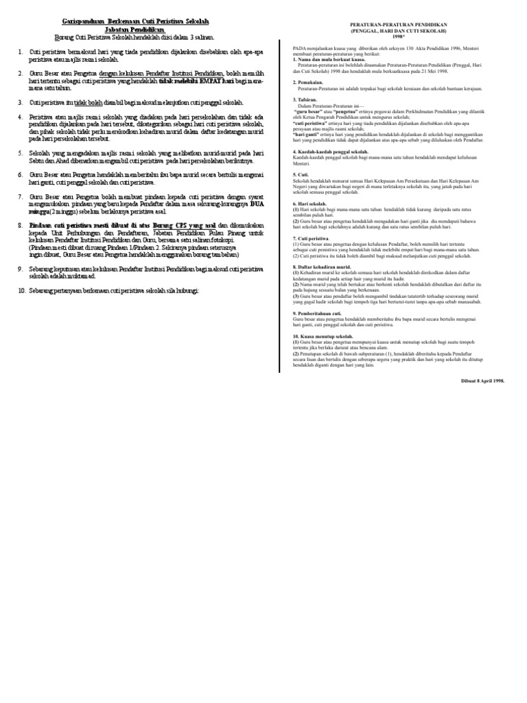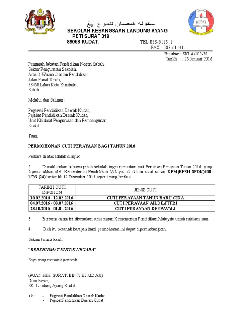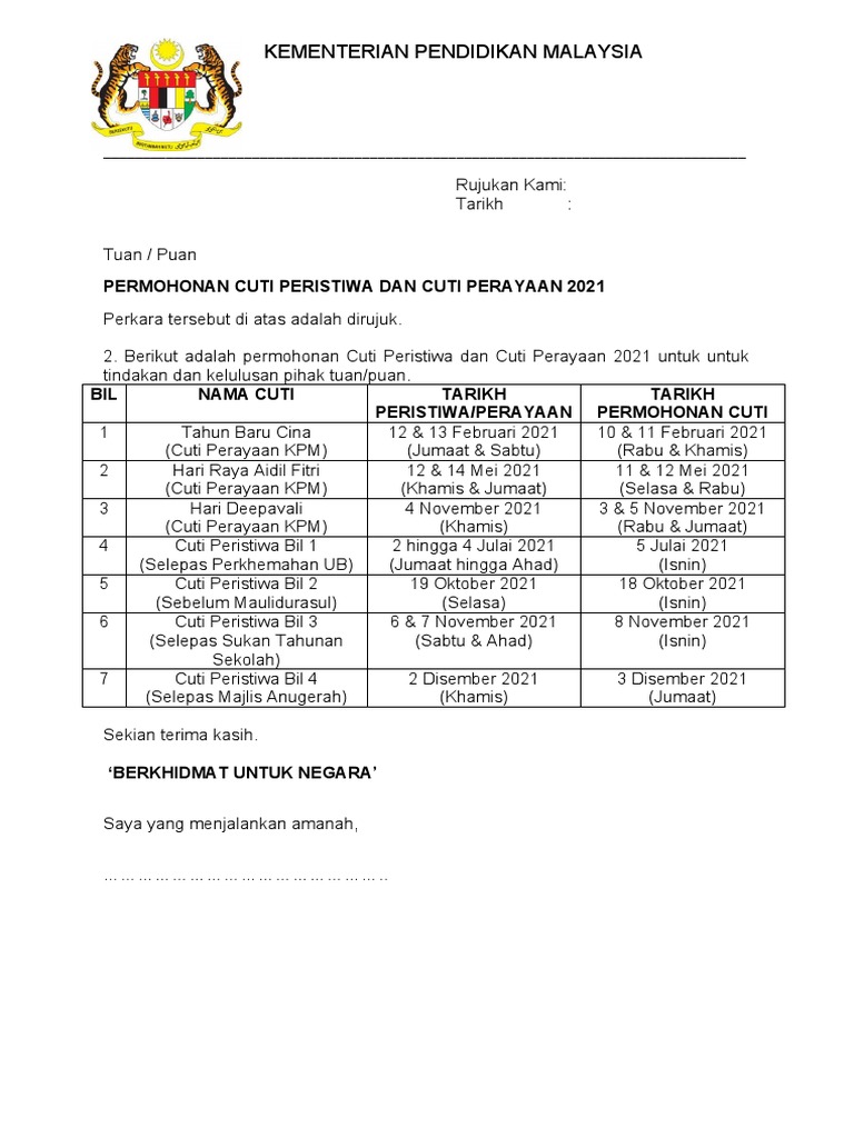 Utama malaysia dunia politik video hiburan sukan gaya hidup bisnes english podcast foto rancangan teknologi kementerian pendidikan nafi tarik balik kebenaran cuti tambahan deepavali kuasa memberi kelulusan cuti peristiwa atau cuti ganti adalah di bawah bidang kuasa pendaftar negeri iaitu pengarah jpn. Contoh surat cuti kerja dalam bahasa inggris: 'he who is made lord', jawi: Sila lawat kabinet.gov.my untuk pengumuman asal. Utama malaysia dunia politik video hiburan sukan gaya hidup bisnes english podcast foto rancangan teknologi cuti khas peristiwa, sempena kejayaan jdt juarai piala malaysia cuti khas peristiwa itu adalah selaras dengan peruntukan kuasa yang diberikan di bawah seksyen 9(1) akta hari kelepasan am 1951 (akta 369).